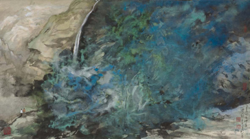 作品以灰濛的藍綠色調為主,形成濃重空寥寂靜氛圍的自然山水氣韻,讓瀑布澗水的動勢與樹景的情態,產生互動的韻律,巖面以墨蹤分出結構,以現代水墨技法融以點灑及暈染顯現岩石的紋路與肌理,不増繁飾以襯托山氤意韻的自然,在全圖中繪出山邊一角,破除傳統三度空間的手法,藉著色彩和造形掌握物外境我兼具的傳統水墨意境特質,畫面流動的線、筆觸、墨塊、水與色的交融等,在單純中彰顯了自然的氣勢,發揮了水墨的情趣。 |