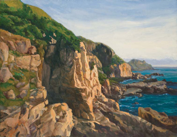 「龍洞晨曦系列」作品,係以時光流嬗對大氣景觀所產生的變化為主題,其瞬間光影凝結,瞬息萬變,然對整體山容形式的場域,卻有非常大的影響。畫面中寒暖對比強烈的色彩,粗獷豪邁的刀法筆觸,顯現濃烈的夏日清晨氛圍,且帶著浪漫神秘的氣息。 |