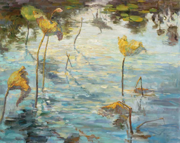 冬天,通常只剩殘存的枯荷葉片蹤跡,徐風陣陣吹來,湖面漣漪清晰可見,殘留在腦海中的是荷葉的姿態,是荷花的溫潤、清香,是筆者對荷的「印象」。湖面透過晚霞陽光投射,露出一絲絲溫暖,此畫中,筆者改以高比例的湖面,一則表現冬季荷跡的殘缺現象;一則呈現冬季給人的虛寒孤獨,色調上雖有檸檬黃的點綴,卻也除不去冷色調給人的寒冷感覺,色彩往後延伸,以少數的水中倒影之暖調子呼應,亦在使前景的藍色水面更顯寒冬氛圍。 |