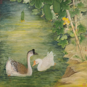 清晨第一道曙光乍現,農村菜園、絲瓜藤、池塘邊,有一對天鵝。公鵝昂首仰望天空,神情狀似警誡;模樣可愛的母鵝,低頭覓食,怡然自在悠遊在這小天地裡。 |