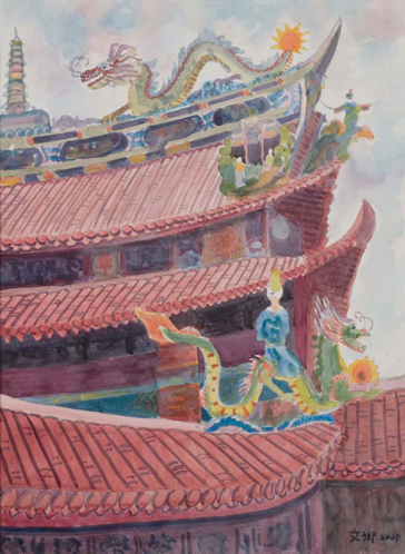 中國傳統建築別具特色,其中又以廟宇建築保留最多豐富的裝飾,廟脊上人乘龍背遠望,具有守護黎民,保佑廣大信眾的意味,予人安定精神的力量,藉著這樣的「望」,帶領人們寄望未來,懷抱希望。