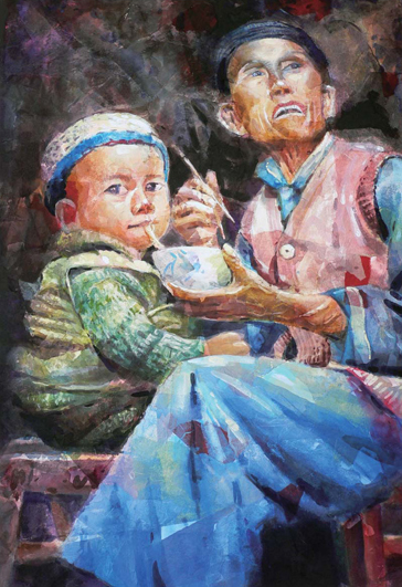 創作重點是透過日常生活中的餵食表達祖孫之間的情感,畫面的布局採用簡單的對比方式,顏色方面,利用左右畫面兩種不同的色系和彼此衣服與肌膚的深淺襯托,清楚突顯祖與孫的形象;祖父臉跟手上的皺紋和小孩稚嫩的臉龐形成強烈但卻和諧的比照,祖父手中的碗和筷子也跟孫兒嘴上吸吮的食物更增添濃厚的日常親情。 |