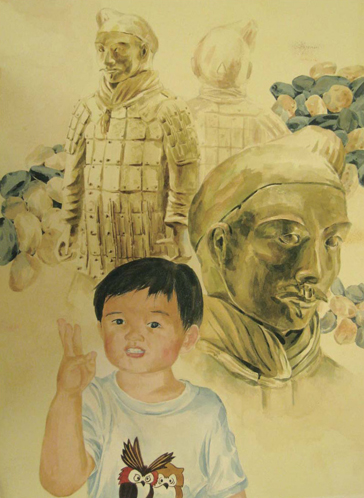 這是一幅紀念性質的畫作記錄,當曾被歷史洪流淹沒的俑人出土,展示當年的強權與暴力之際,比照稚齡幼子的純真,回首過往人生的記憶,就如同歷史的洪流也會在此刻凝結成石。在色彩的表現上,作者以赭、棕等色系表現俑人因泥土覆蓋多時的樸拙,澄澈的施彩方式表現塵埃落定的千年歷史,給予世人的啟示與省思。 |