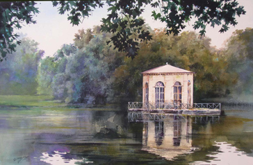 描寫法國凡爾賽公園的湖畔,茂密的森林將湖中白色建築襯托出來,微風吹拂的湖面漣漪陣陣,畫面呈現寧靜的感受。