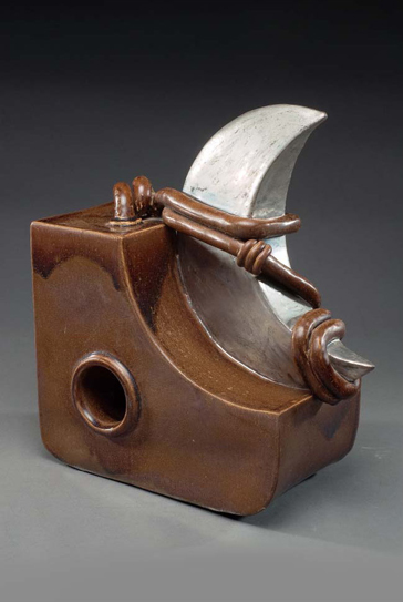 商紂王為妲姬建高台試圖抓月亮,李白酒醉水中撈月。月亮是帝王,千古文人雅士、騷人墨客詩情畫意的創作泉源,也是夢想仙境。更是男女愛情山盟海誓最佳見證。年輕時,為追求心儀的另一伴,不能免俗的指月起誓,非將月亮抓下來綁住送給她,無非只是想獲得與己共創未來。綁住月亮在住家閩南馬背斜斜屋頂上,是誓言愛情堅貞、誓言心中永遠像皎潔月亮一樣對待,誓言永遠給一個幸福的家直到永遠。作品中的月亮用粗粗的土條綁在閩南馬背式建築斜斜屋頂上,中以圓圓的洞穿透其中,象徵陰陽調和。蘇東坡水調歌頭有云:「人有悲歡離合,月有陰情圓缺…」。「綁住」月亮在這裡只是形容詞,如何在感情上出現陰情圓缺時,能用心經營、用行動印證,絕對可達到如東坡先生所說:「千里共嬋娟」。 |