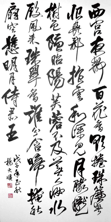 書法乃我國固有文化,其特色為筆墨變化,透過書寫的輕重緩急加上墨色的濃淡乾濕,加上字體的變化,產生獨特的書法藝術。本幅作品屬行草書創作,希望能將以上之書法的重要元素一一展現,因此本人創作時,注意到墨色的濃淡乾濕透過行筆的輕重緩急加上行氣的迭宕,並以二首七言絕句為書寫內容,將文學與書法藝術結合,創作一幅豪放、乾脆但富有韻味的作品。 |