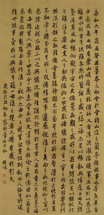 蘭亭序字體端莊秀麗,書寫如行雲流水,後人稱為天下行書第一,王羲之趁著微微的酒意,揮筆為大家的詩作寫了序言。過去往往我們會認為臨帖,就是在學習如何寫得像、寫得一樣;但筆者認為臨帖更是在學古人的書寫精神,體會那名帖流傳的背後,作者所投下的感情。觀看蘭亭序似乎可以從用筆的輕快、婉轉、圓潤中,體現出一種愉悅快速書寫的感覺。王羲之並非因為輕快的用筆而失去在書寫中最重要關鍵「寫字」,王羲之對於每筆的點畫之間給予了清楚的交代,尤其是蘭亭序後半部分情緒正處於興致高昂時,對於起