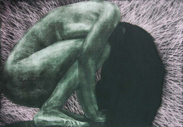 作品《釋放》詮釋我在某階段的愛情觀點,以女人面對愛情的兩種心態相對照作為題材。在這件作品裡,描述的是面對愛情的態度:在美好的愛情背後,必須所承載的什麼樣的壓力,我以美柔汀凹版畫的製作方式,刻畫出內在情感的轉換與調適狀態。