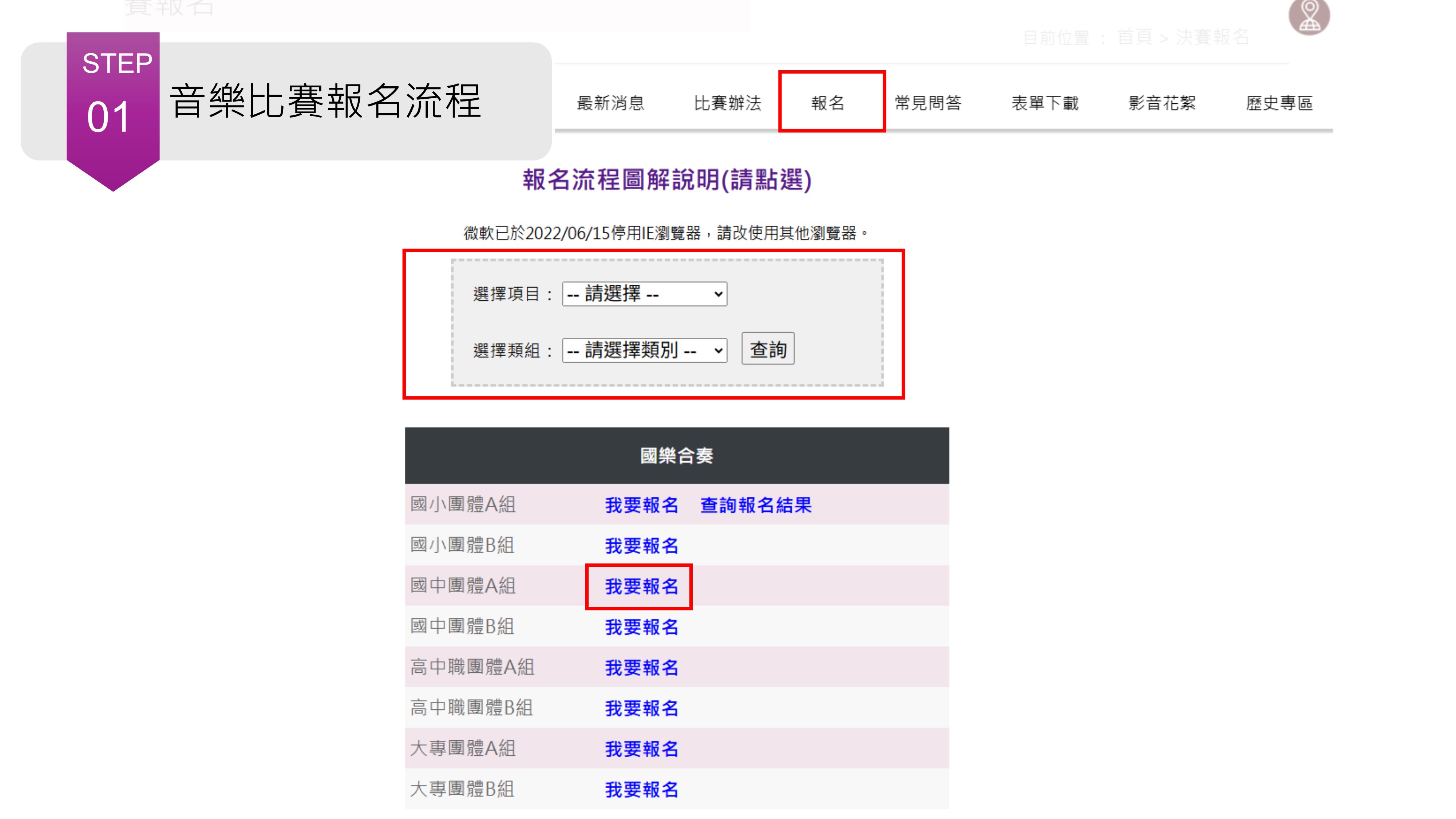 (1)點選「報名」。(2)選擇「項目」、「類別」。(3)該各組別清單中,點選欲報名組別右邊的「我要報名」。