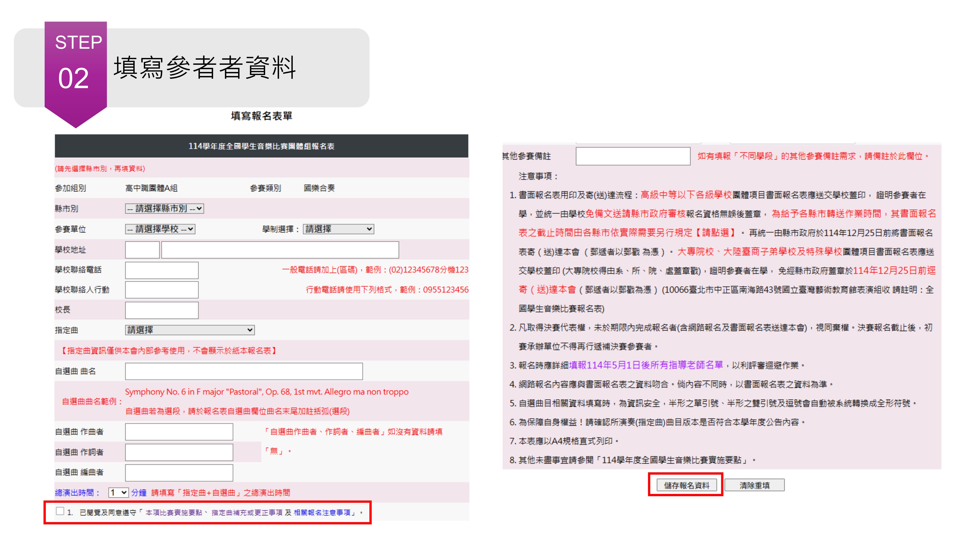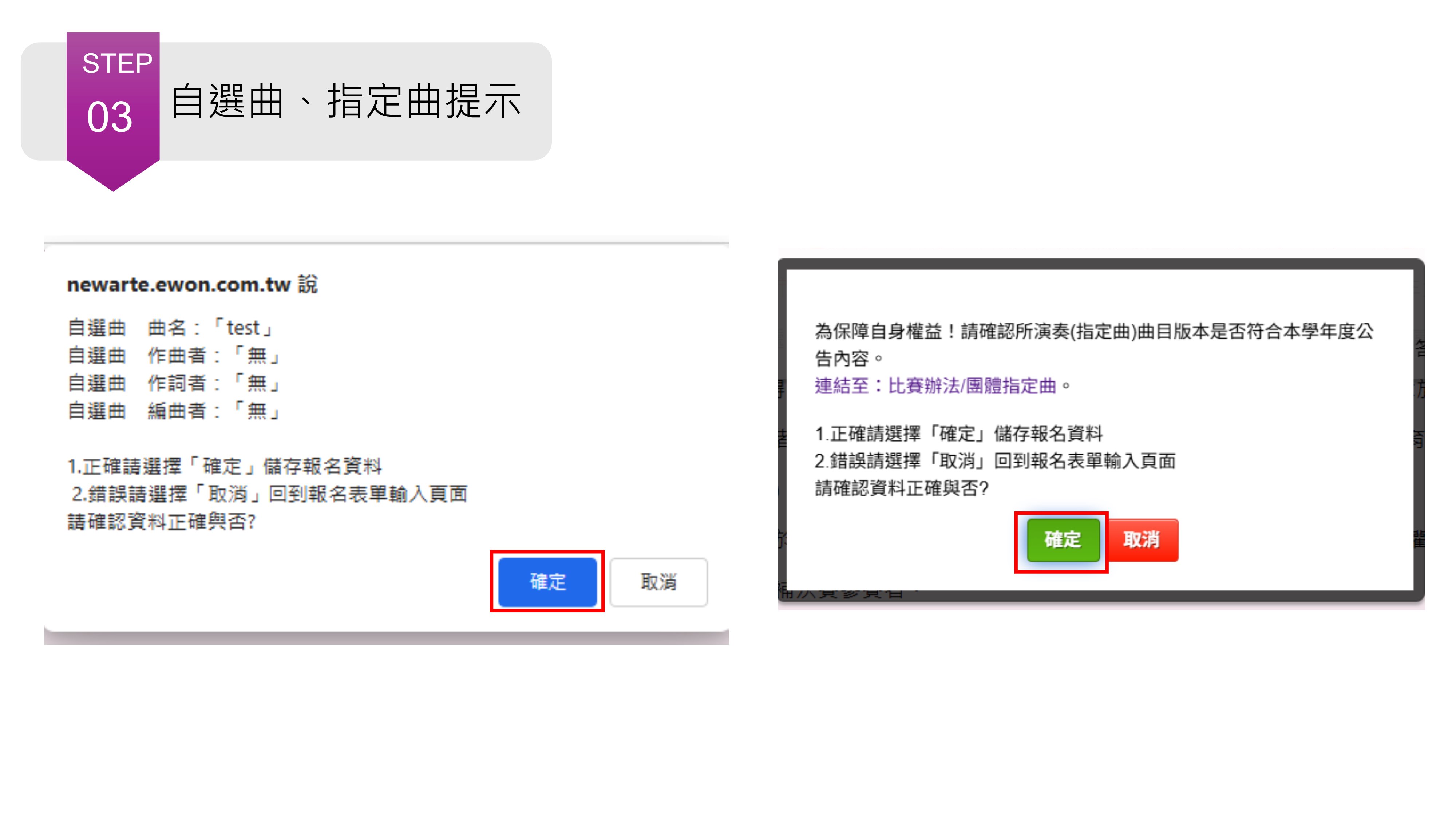 報名資料送出儲存後,系統會跳出「自選曲」及「指定曲」之提示視窗,點選「確定」。