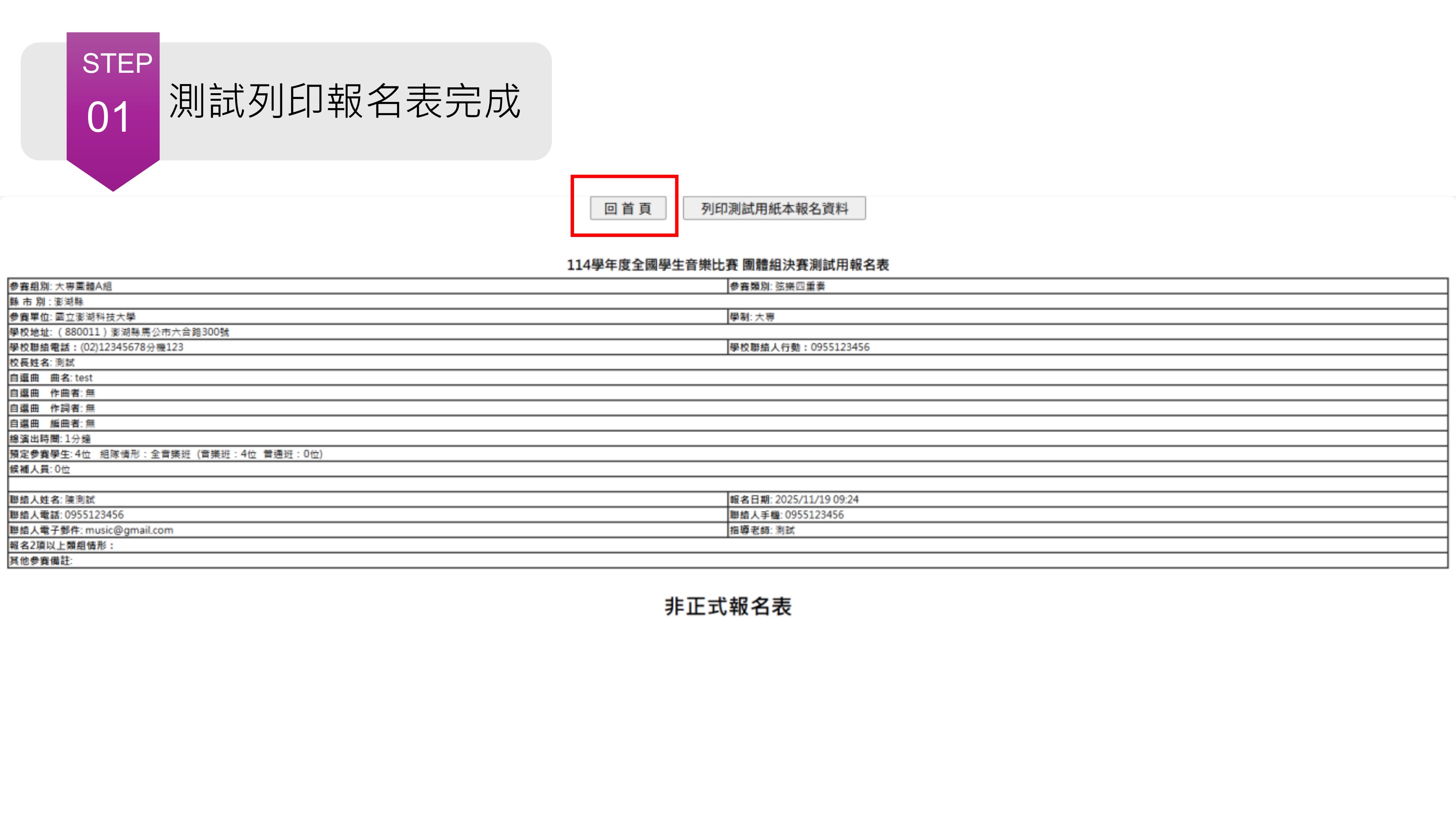 ☛Step1.完成測試列印報名後,按「回首頁」。