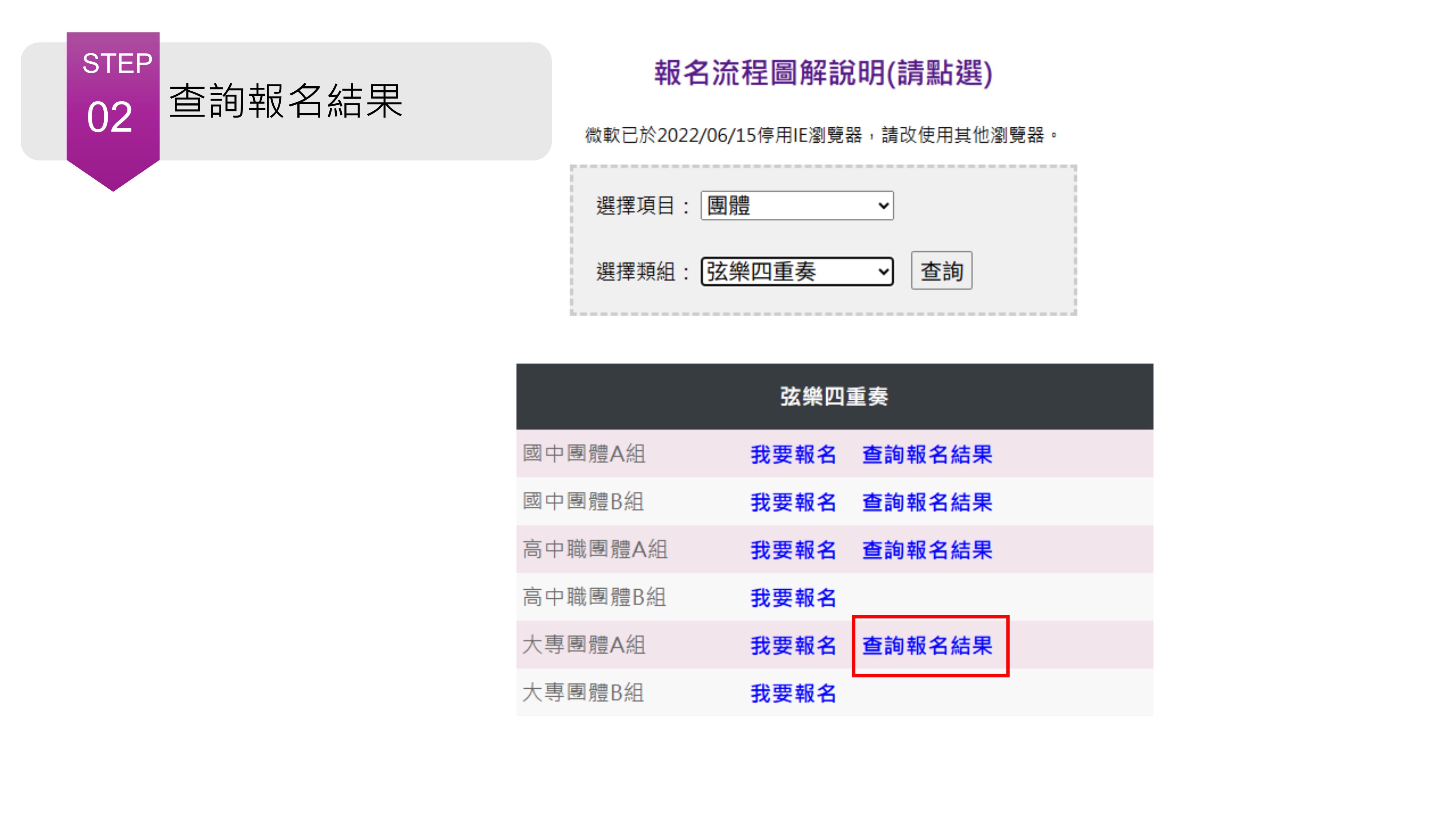 ☛Step2.確認資料無誤後,再次回到報名區,點選「查詢報名結果」。