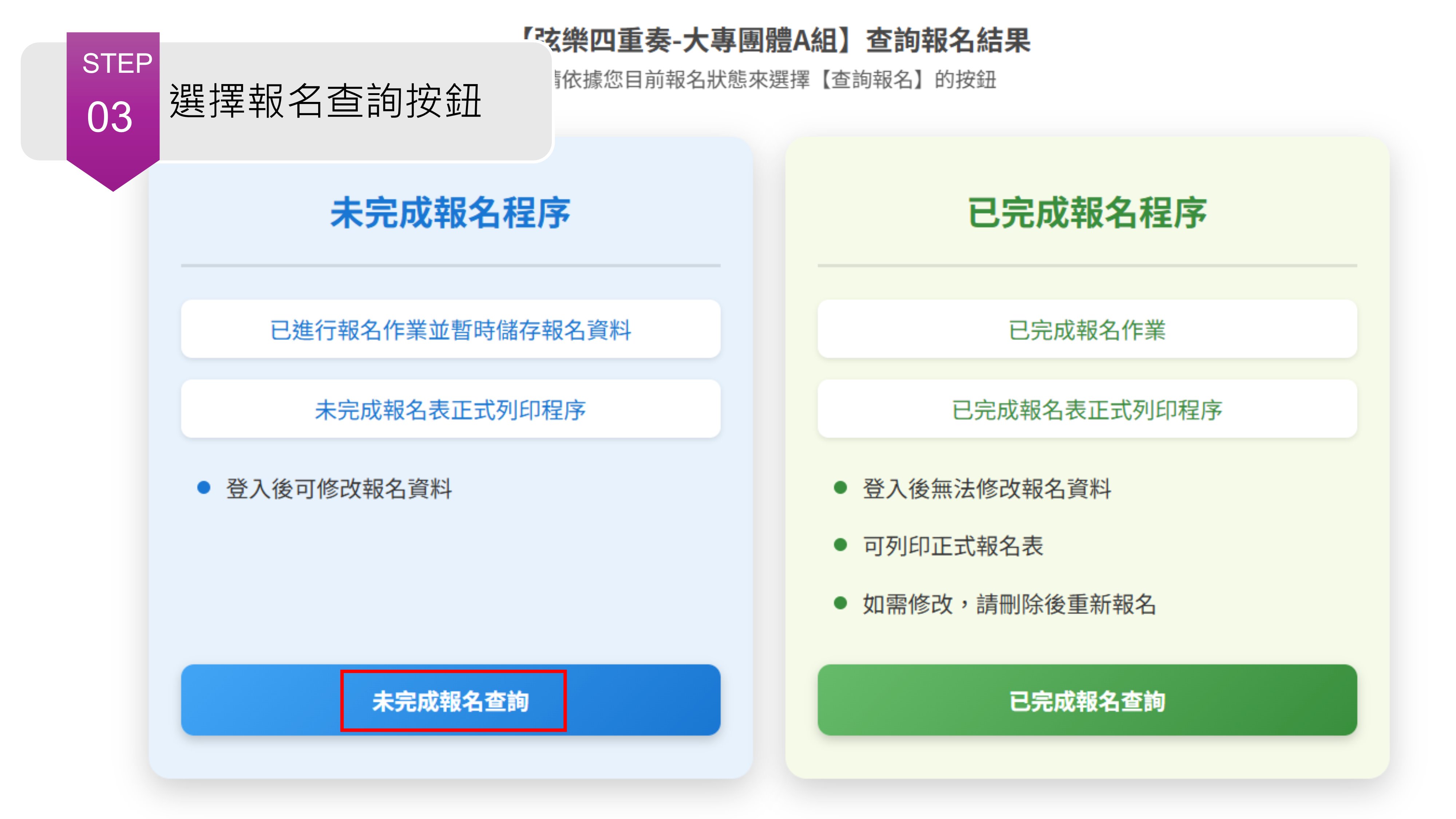 ☛Step3.依據目前報名狀態來選擇報名查詢按鈕,點選「未完成報名查詢」。