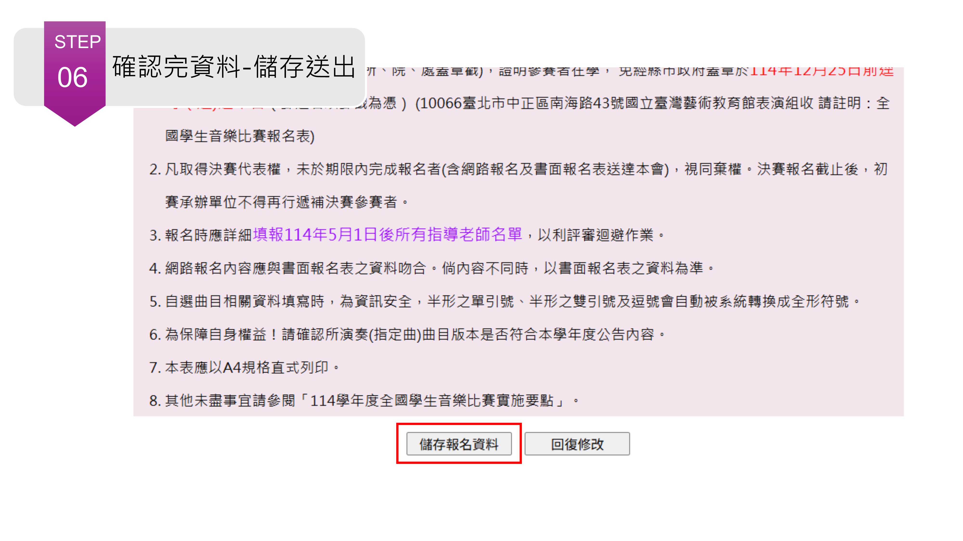☛Step6.確認各項資料填寫正確無誤後,按「儲存報名資料」。
