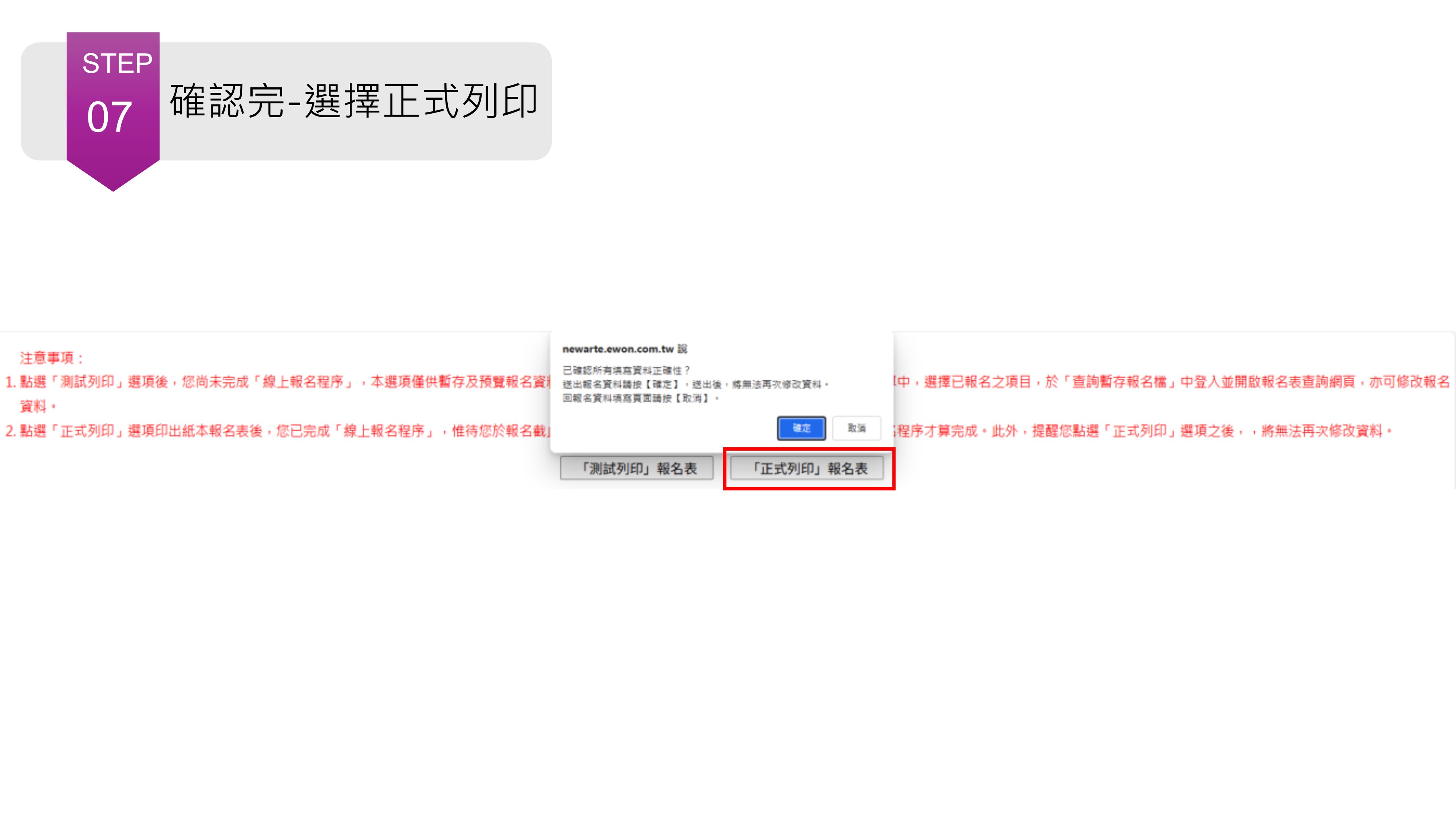 ☛Step7.出現測試列印與正式列印選擇:請選擇「正式列印」。